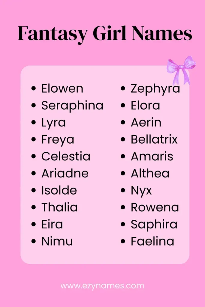 Fantasy girl names transport readers into magical worlds filled with wonder and adventure. These names often draw inspiration from mythology, nature, and invented languages that sound otherworldly.